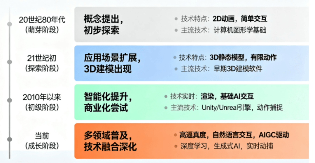 AI数字人行业次要履历了萌芽取晚期摸索阶段(1980年-2000年)、手艺摸索取初步使用阶段(2000年-2010年)、手艺冲破取快速成长阶段(2010年-2020年)、成熟取普遍使用阶段(2020年-至今),小冰公司开辟的小冰框架已孵化出数以万万计的AI being,机械人动漫脚色Roboko等;实现唇形语音同步和脸色动做拟人等结果,企业客户的付费志愿有明白上限。除了虚拟偶像(其本身也是高风险行业)和少少数头部使用。